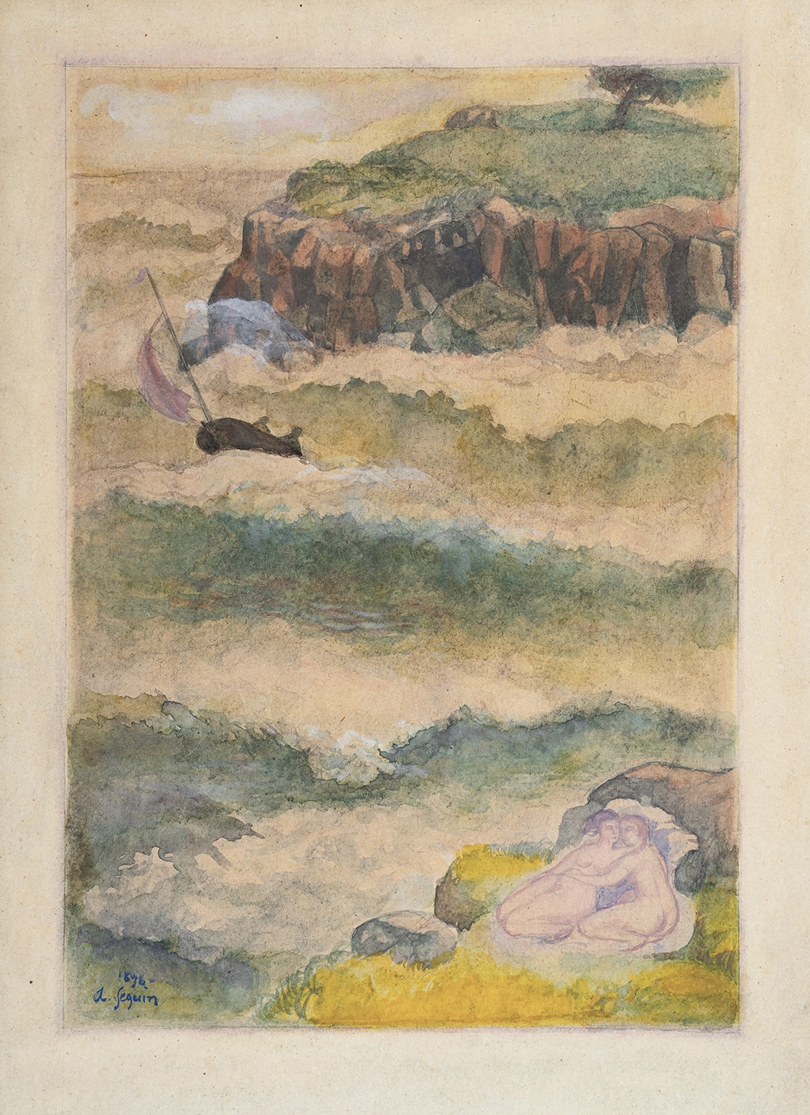 In 1891, he travelled to Pont-Aven and formed a lasting friendship with the Irish artist Roderic O’Conor, who introduced him to etching. In 1893, Seguin established a close relationship with Gauguin, whom he would thereafter regard as his master. Between 1891 and 1896, the artist experienced his most fertile creative period, which was marked by his participation in the 10th and 11th Peintres Impressionnistes et Symbolistes exhibitions at Le Barc de Boutteville in 1895 and 1896. This flourishing phase proved brief: commissions declined, financial pressures increased, and his production slowed, forcing him to turn to modest illustration work. In a letter to O’Conor, he expressed his frustration: “Every day, every night I dream of the paintings that I cannot execute.” Our sheet belongs precisely to the latest stages of this fertile period. On our sheet, figures and landscape emerge without strict contour as diluted pigments diffuse into the paper, while muted greens and earth tones lend the composition its calm, luminous atmosphere. In keeping with the rest of his work produced in 1896, our Bathers reveal his method of building form through translucent washes.