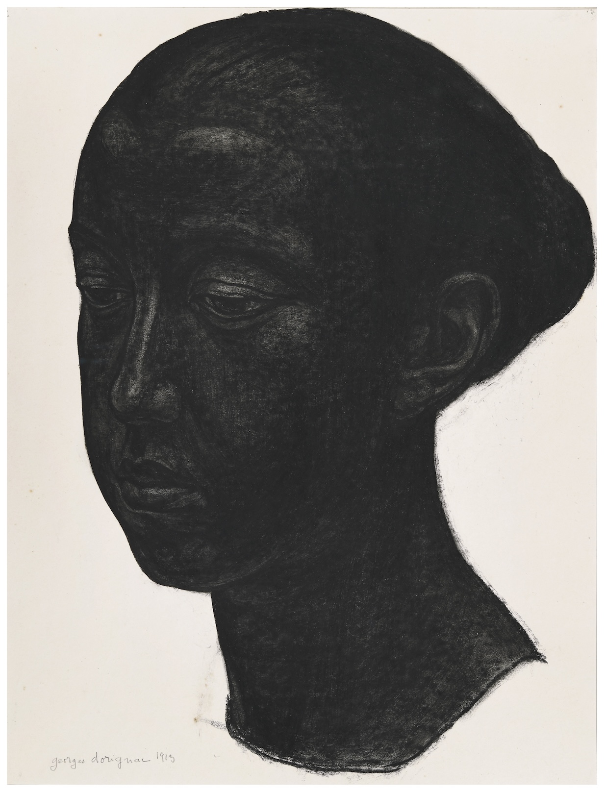 Executed in 1913, our Portrait of Georgette, the Artist’s Daughter, belongs to this pivotal momen in Dorignac’s career. Using charcoal with exceptional density and control, he constructs the head almost entirely through black mass, allowing form to emerge through subtle modulations of pressure. The face is modelled as if carved from shadow, recalling sculptural relief while demonstrating Dorignac’s ambition to endow drawing with the physical presence of sculpture. While Dorignac often applied this technique to anonymous or archetypal figures, the choice of his daughter as a model lends the drawing a particular intimacy. The inward gaze and restrained pose reinforce the timeless and monumental character of the image, which is one of his most accomplished. This synthesis of personal subject matter and radical formal language is characteristic of Dorignac’s work during these years and underscores the originality of his contribution to modern drawing. The Portrait of Georgette stands as a key example of Dorignac’s ambition to elevate drawing to rival painting and sculpture in expressive power.