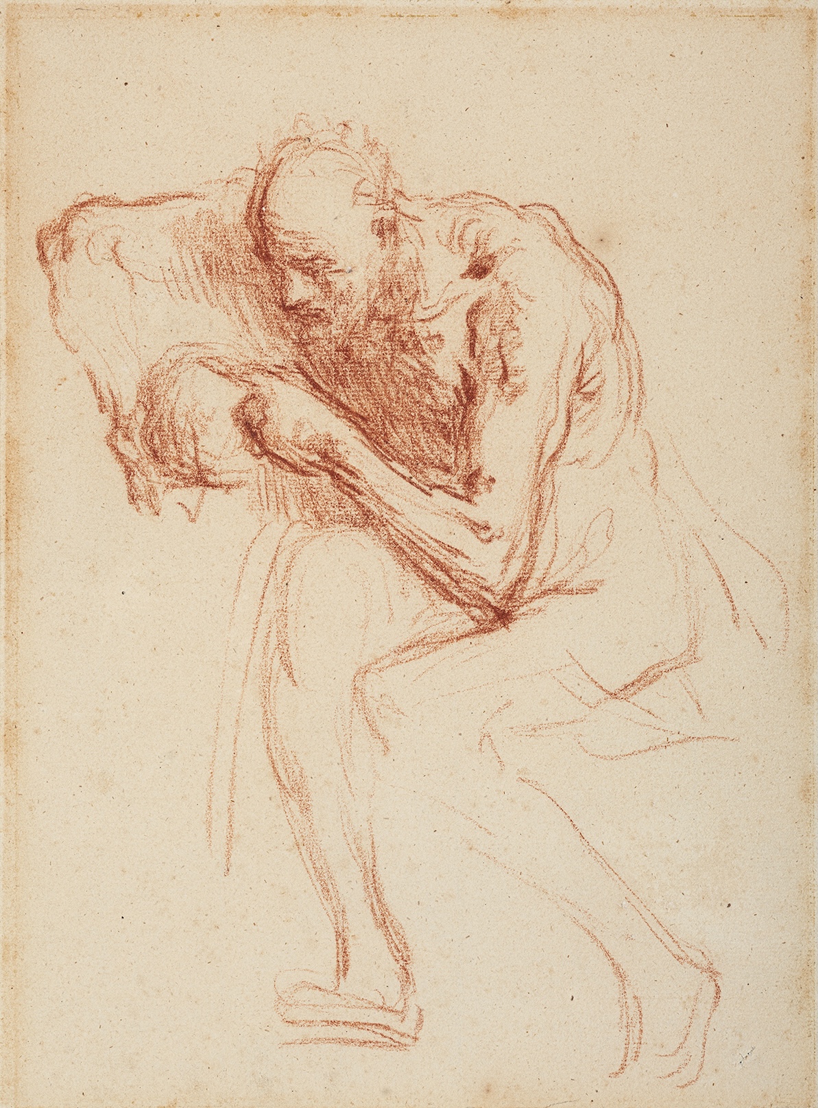 Only two preparatory studies for the painting The Temptation of Saint Jerome are known: one sold at Christie’s, Paris, at the sale Dessins Anciens et du XIXe Siècle, 21 March 2018 (lot 120), and our drawing. More exploratory in character, our sheet records Millet’s first thoughts on the subject, before the composition was further elaborated.Executed in red chalk – a medium used only sparingly by Millet and therefore particularly noteworthy within his graphic œuvre – the drawing is marked by the expressive power of the Saint’s head. As claimed by Alfred Normand, who owned the drawing in the 20th century, in his inscription on the verso of the drawing, “this is one of the very rare red chalk drawings by the artist, who only made ten or so at most. It is comparable to a Tiepolo or a Rembrandt”. Indeed, the compositional vividness and nervous use of red chalk lend the sheet a distinctly Rembrandtesque character which recalls the chiaroscuro effects of 17th-century Dutch painting admired by Millet.